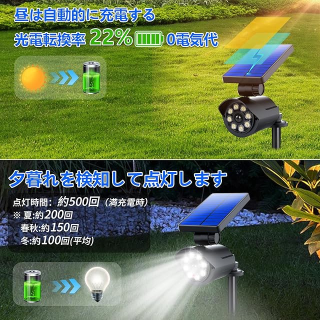 【ソーラー発電&電気代ゼロ】ガーデンライトは単結晶ソーラーパネルを採用して、エネルギー転換率は22%!昼間は太陽の光を受けて内蔵されたリチウム充電池に充電されます。日没後はリチウム充電池を利用して人が検知されるとLEDが自動的に点灯できます。また、大容量な内蔵式充電池(1800mAh)により、完全に充電した後、一晩中(8-12時間)使うことが可能です。800ルーメン、最大の照明範囲は10メートルに達して、照明効果抜群です。完全に太陽エネルギーを利用して、環境にもやさしくて、電気代0にも実現するソーラーライトです!