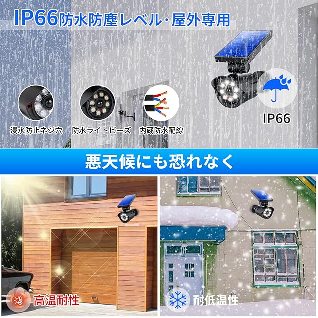 【IP66防水構造&角度自由調節】センサーライト防水は高品質ABSプラスチックで作られており、回路とバッテリーを保護し、寿命を延ばします。IP66防水グレードは、あらゆる天候への耐熱性、防食耐性を有します。光の照射角度を90°まで調節でき、ソーラーパネル部分は上下90°に動くことができ、180°回転スクリューを加えると360度調節可能です。庭 ライト ソーラーは玄関先や庭、駐車場、ベランダ、ガーデンなど、電力を使わずに屋外を強力に照らす際に便利なLEDソーラーライトです。