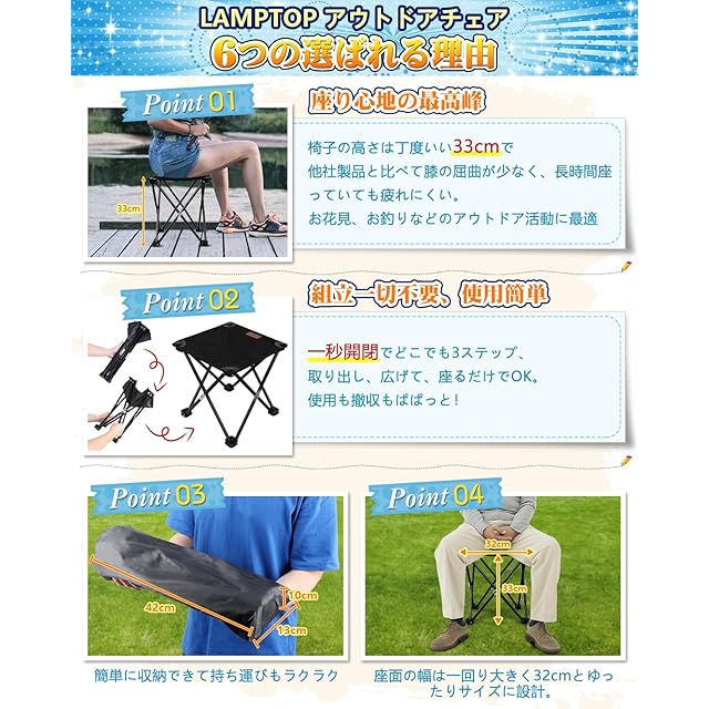 商品名:【一秒開閉】LAMPTOP アウトドアチェア 折りたたみ椅子 軽量 コンパクトイス キャンプ椅子 耐荷重150kg 座面32×32cm 高さ33cm 収納バッグ付き 携帯便利 お釣り バーベキュー キャンプ 焚き火 登山 お花見(ブラック)