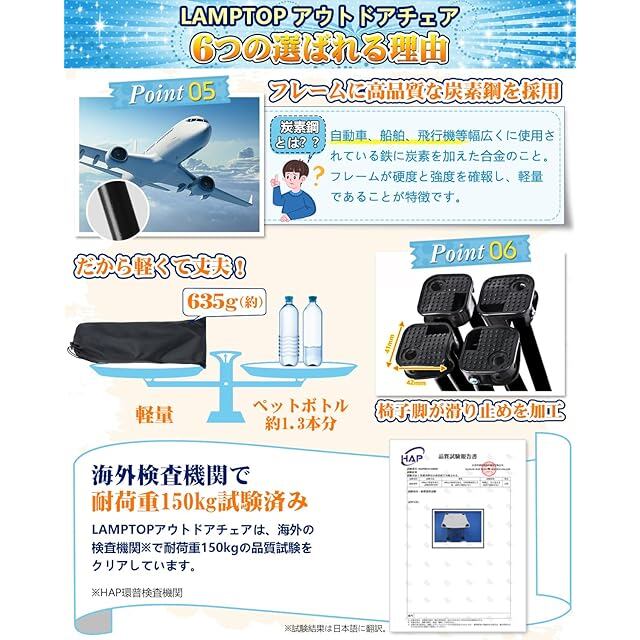 <p>品名:LAMPTOPアウトドアチェア(折りたたみ椅子)</p> <p>カラー:ブラック、ページュ</p> <p>サイズ(約):座面32×32cm 高さ33cm </p> <p>重量(約):635g</p> <p>耐重量:150kg (海外の第三者試験機関による180kgの荷重試験に合格)</p> <p>材質:</p> <p> 座面シート:ナイロンオックス</p> <p> フレーム:アルミニウム合金</p> <p> 収納袋:ナイロンオックス</p> <p>内容物:アウトドアチェア(座面、フレーム一体型)、収納袋、説明書</p> <p>特長:</p> <p> 本製品は様々なアウトドアシーンで活躍するチェアです。独自のフレーム構造により、ワンタッチで一秒開閉、コンパクトに折りたたみ、収納袋に入れて容易に携行できます。大きな座面サイズとちょうどいい高さで座り心地を大幅向上、男女を問わず座りやすく、長時間の使用でも快適です。フレームは厚さ14mmアルミニウム合金製で、軽量性と耐荷重性も備えています。専用の収納袋が付属していますので、使用しないときの保管も簡単です。</p> <p> </p> <p> </p> <p>注意事項</p> <p> </p> <p>本製品はアウトドア用に設計されたチェアです。それ以外の用途には使用しないでください。</p> <p> </p> <p>小さなお子様がご使用になる場合、保護者の方はお子様から目を離さないでください。</p> <p> </p> <p>本製品の静止耐荷重は180kgと測定されていますが、体重が150kgを超える方は、安全のため慎重にご使用ください。</p> <p> </p> <p>使用中に異常や変形を感じた場合は、直ちに使用を中止してください。</p> <p> </p> <p> </p> <p> </p> <p>検索キーワード:折りたたみチェア/軽量椅子 アウトドア/ アウトドア 椅子 コンパクト </p> <p> </p> <p>/キャンプ イス/キャンプ用椅子 / アウトドア 座椅子/折り畳み椅子 アウトドア/ 折り畳みチェア /折りたたみ椅子 アウトドア/折り畳み椅子 室内 / キャンピングチェア/折り畳み 椅子/ 折りたたみ椅子 軽量 /折畳椅子/アウトドア チェア コンパクト / ポータブルチェア/椅子 折り畳み/ 携帯椅子 /キャンプ 椅子 コールマン/椅子 折畳み / 折りたたみいす/バーベキュー 椅子/ 折り畳み椅子 軽量 /アウトドアチェア コンパクト/アウトドア椅子 / ステッキチェア/簡易折りたたみ椅子/ 屋外 椅子 /キャンプイス/椅子 キャンプ / 人気のミニ 折りたたみイスランキング/人気のアウトドア チェア コールマンランキング / アウトドアチェア 軽量/スツール 折り畳み / 小さい椅子/コンパクト折りたたみイス/ キャンプ 椅子 折り畳み </p>