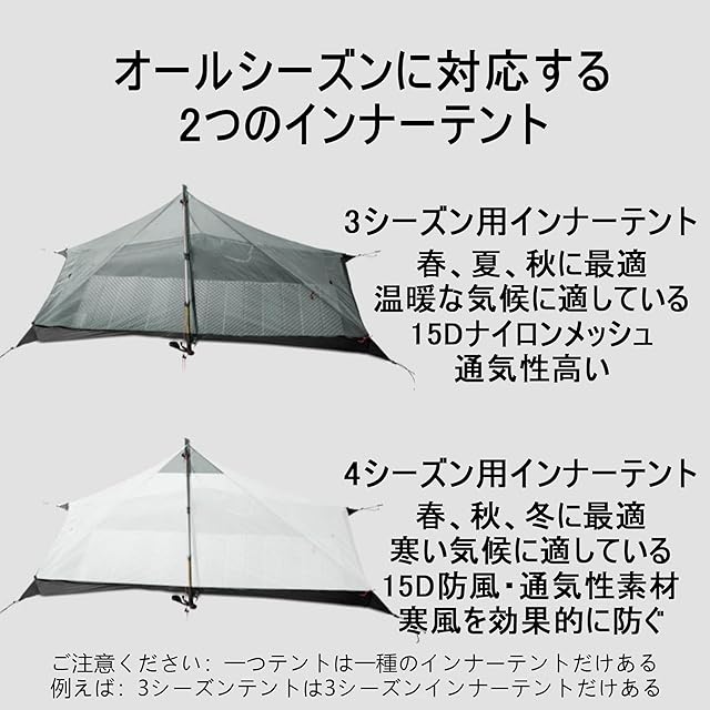 【大空間・二種類のインナーテント】登山やハイキングなど、大自然の中で体を酷使する場合は、質の良い睡眠も非常に重要です。そして質の高い睡眠のためには、快適な睡眠空間が不可欠です。この防風テントは改良され、テント内のスペースがさらに拡大され、活動スペースが拡大されただけでなく、収納スペースも拡大されました。このような広いスペースは、寝袋を簡単に収納できる一方で、荷物など他の重要なアイテムを収納する十分なスペースがあります。これにより、テント内でより快適に休むことができるだけでなく、荷物も安全に保管できます。そして、このテントには2つのインナーテントが用意されています。3シーズン用インナーテントは15Dナイロンメッシュ糸を使用し、通気性があり、春、夏、秋の温暖な気候に適しています。4シーズン用インナーテントは、15D防風透湿素材で構成され、春、秋、冬の寒い気候に適しています。お客様のニーズに合わせてお選びいただけます。