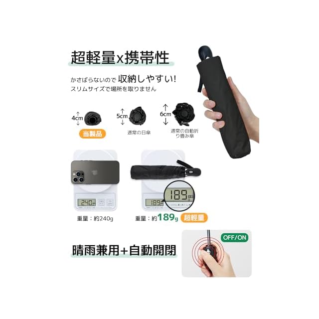 【超軽量*携帯便利】 折りたたみ日傘フラットなデザインで、バッグに簡単に入れることができます。折りたたんだ厚さはわずか4cm、長さは25.5cm、重さは約189gです。超コンパクトボディ 使用?携帯に便利!全天候対応でき、雨の日も雪の日も晴天も使えます。男女兼用ワンタッチ 自動開閉折り畳み傘。通学、通勤、遠足、旅行,出張などの場合がご利用できます。