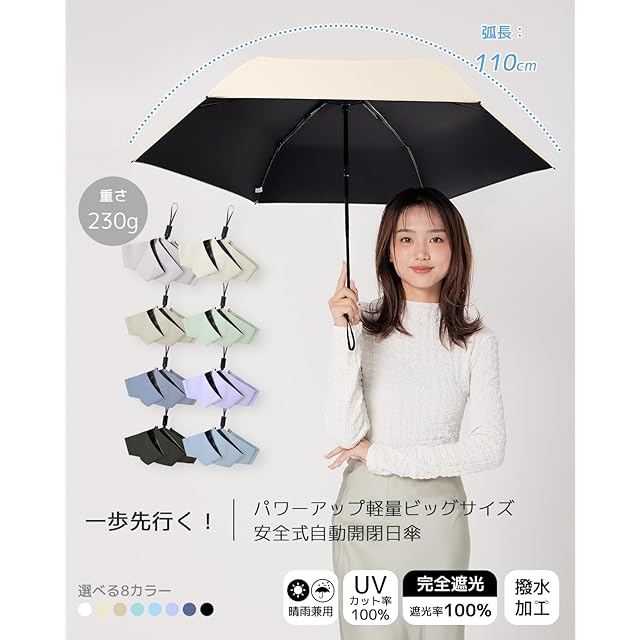 【晴雨兼用&超撥水性】優れた抗水性を備えた310T防水ファブリック生地を採用し、特別な加工により、出色の撥水性能を実現しました。使用後に軽く振るだけで傘が乾きます。また、内側は多層コーティング処理が施されており、紫外線を効果的にカットしますので、日よけとしてもご利用いただけます。