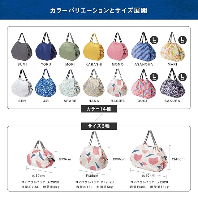 【さらにコンパクトに、もっと大容量に。】丸めた時の直径は約6.5cmで重さは約118g。Mサイズと同じ生地へ変更し、従来のLサイズより軽く、コンパクトに。また、耐荷重(約15kg)はそのままに容量は約40Lにアップし、もっとたっぷりと入れられるようになりました。