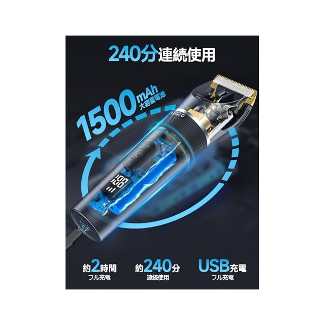 【LEDディスプレイ&大容量バッテリー】LEDディスプレイ搭載で、バッテリー残量やスピード設定が一目で確認できます。これにより、充電切れの心配なく使用でき、計画的な使用が可能です。さらに、大容量バッテリー1500mAhを搭載しており、長時間の使用が可能です。一度の充電で長持ちするため、頻繁に充電する手間が省けます。プロフェッショナルな仕上がりを求める方にとって、信頼性の高いバリカンです。