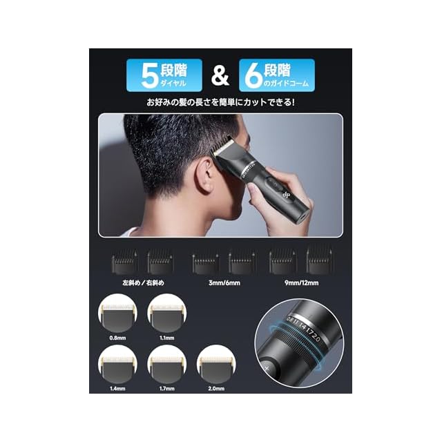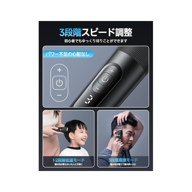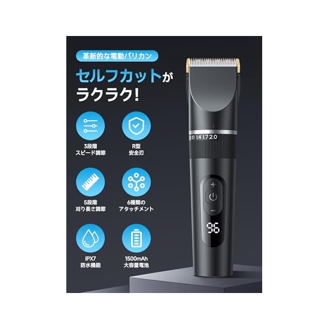 商品名:バリカン 2025新登場 USB充電式 ヘアーカッター 電動バリカン バリカンメンズ 5段階刈り高さ調節 3段階スピード LEDディスプレイ 大容量バッテリー 自動研磨 6種類ガイドコーム 低騒音 IPX7防水 コードレス バリカン子供 家庭用 散髪用 業務用 セルフカット 坊主 ツーブロック 軽量