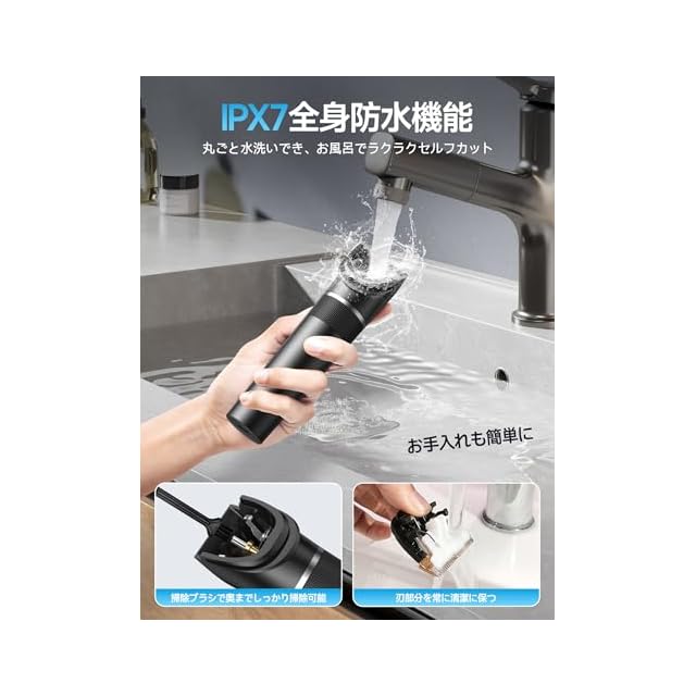 【低騒音&IPX7全身防水】本電動バリカンは、低騒音設計を採用しており、運転中の騒音を最小限に抑えています。家族や子供にも安心して使用でき、夜間の使用も気兼ねなく行えます。また、IPX7防水機能を備えており、シャワー中や湿気の多い場所でも使用可能です。防水性能により、使用後の清掃も簡単で、流水で直接洗えるため衛生的です。防水機能と低騒音の組み合わせにより、いつでもどこでも快適に使用できるバリカンです。